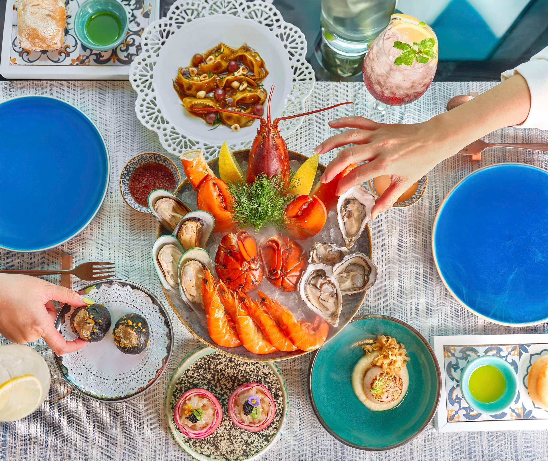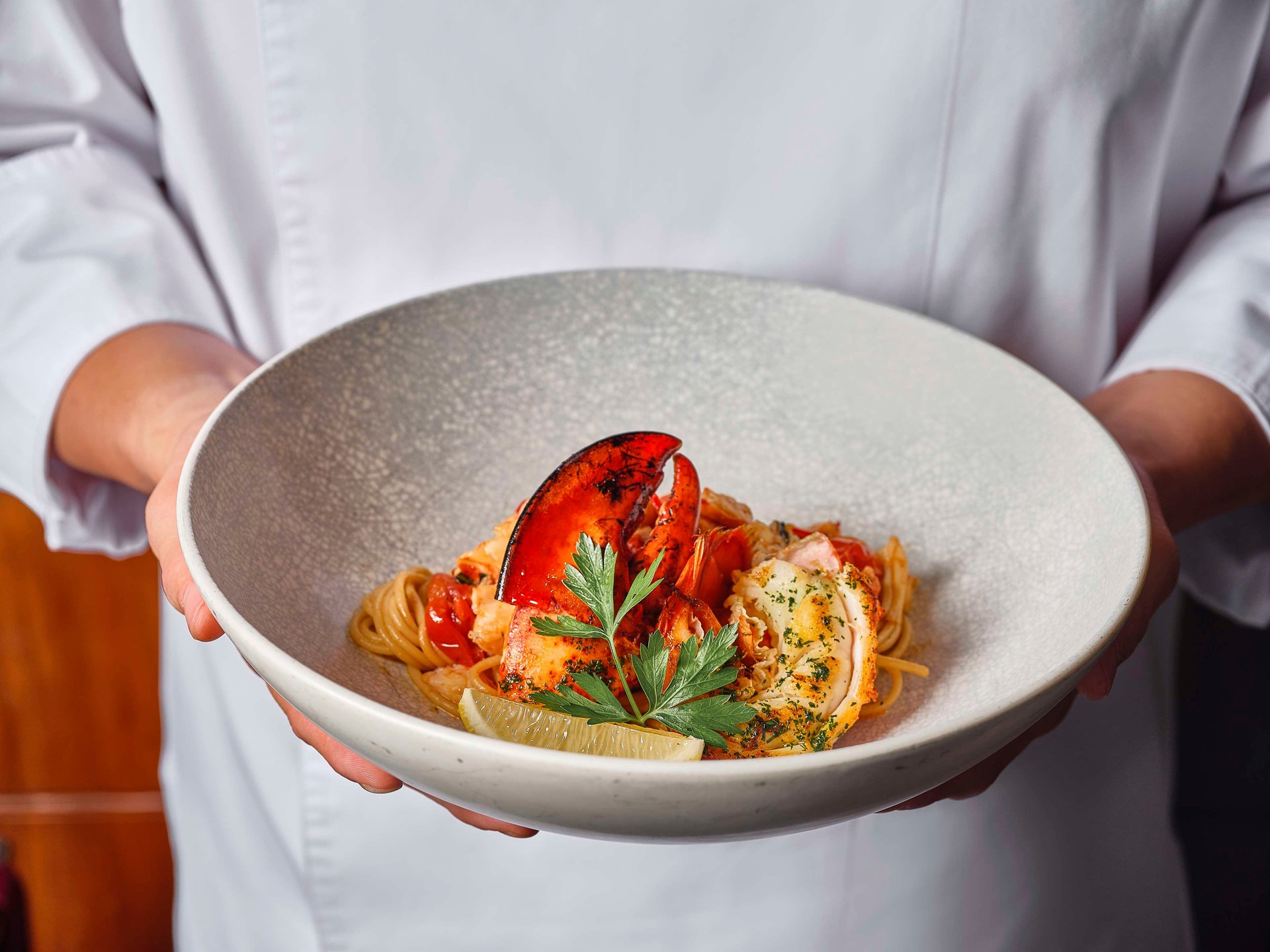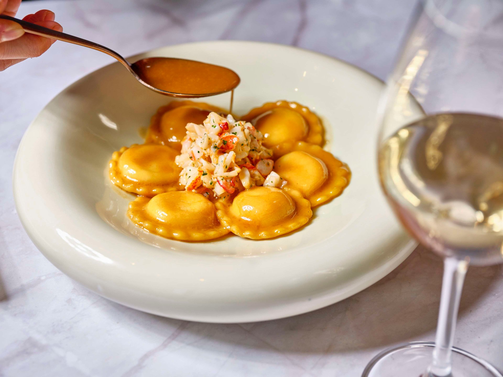 معكرونة مصنوعة يدويًا محشوة بلحم الكركند الطري والطازج الذي يتم اصطياده بشكل دوري من البحر. بينما تتذوق أول شوكة، استعد لتشعر بمذاق الكركند الغني المتناغم بفضل الكميات القليلة والدقيقة من الأعشاب، والزعفران وجبن الريكوتا المنقوع بالليمون. تُطهى المعكرونة حتى تمام النضج، لتكون بمثابة لوحة طرية تضم حشوة فاخرة، ما يضمن توازنًا متناغمًا للقوام الذي يبهرك مع كل قضمة.