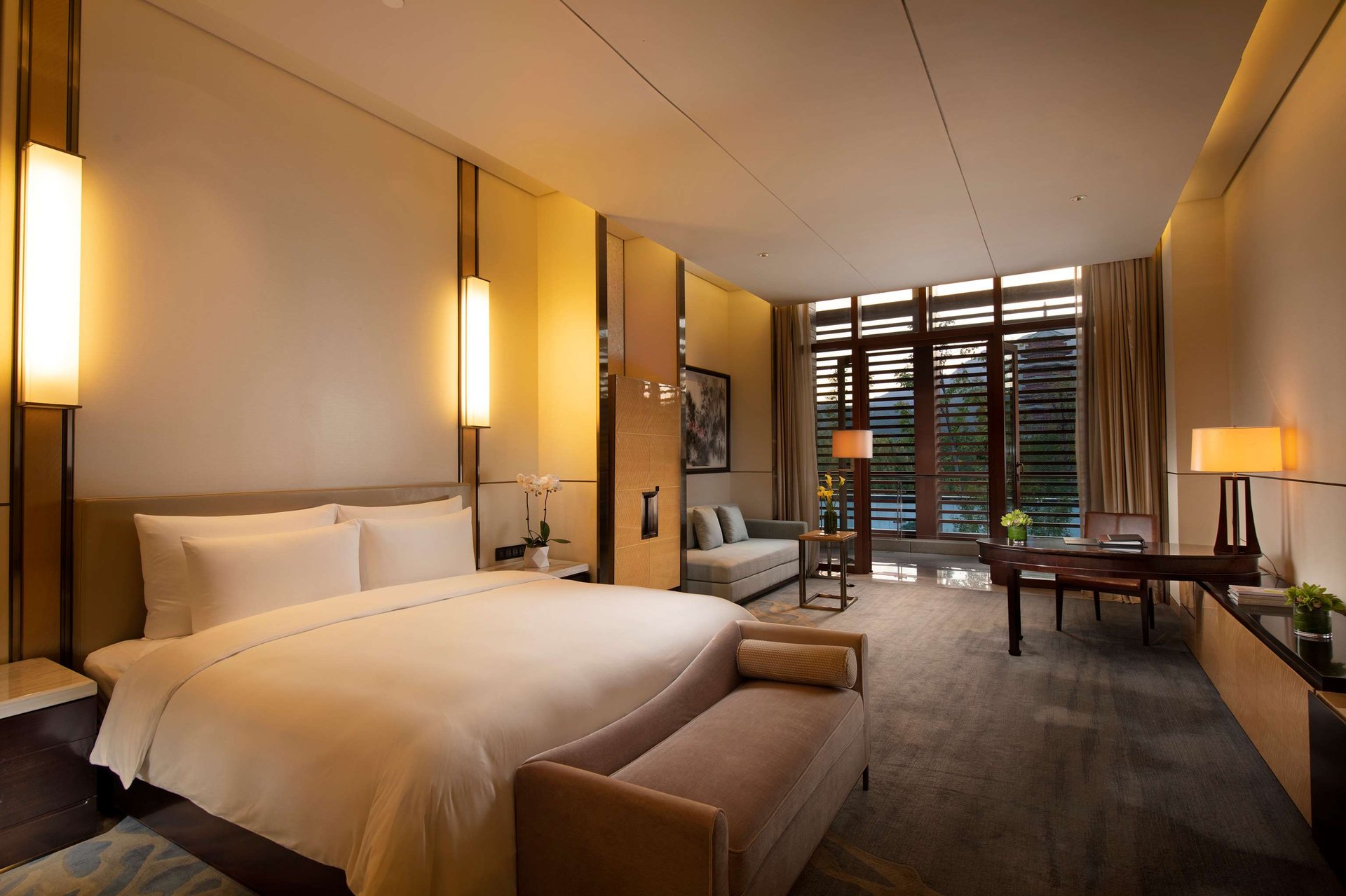 国宾别墅的豪华客房分布在12栋别墅中,每栋别墅都有不同的风格,不仅具有精美优雅的设计、舒适便捷的设施,还拥有清新秀丽的山水或园林景观。