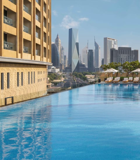 室外游泳池配备豪华设施,背靠城市全景,可欣赏迪拜天际线和哈利法塔的壮丽景色。