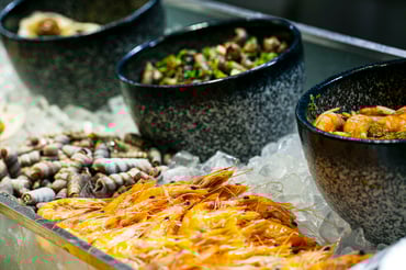 三文鱼、各式辣卤小海鲜、鱿鱼、海兔、花蚬子、钉螺、青虾、干贝丁、大带子、黄金蟹钳等一系列海鲜的重磅诱惑;