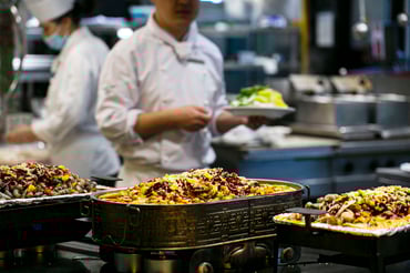 新鲜出炉的牛排、羊排、烤肉、德式猪肘、各种中西式热菜等吃到爽;