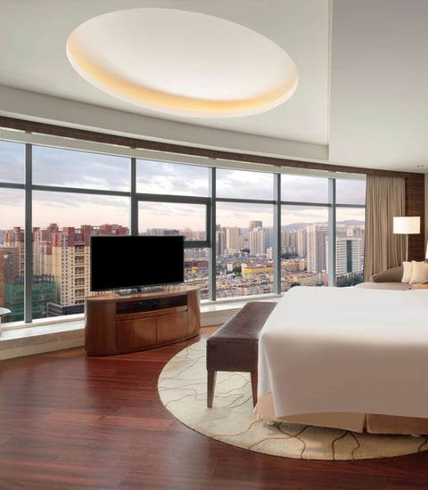 豪华客房可享有太原市中心无与伦比的城市景观,现代化的装修风格,舒适又宽敞。