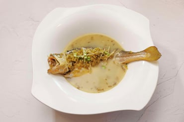 雪菜大汤黄鱼是一道宁波的传统名菜,汤汁咸淳浓郁,鱼肉细嫩雪白。宁波有老话 “三日弗吃咸齑汤,脚骨有点酸汪汪”。这道菜用雪里蕻腌制的咸齑(俗称雪菜)搭配甘脂肥嫰的黄鱼,堪称鲜咸合一的绝配,鲜爽开胃。