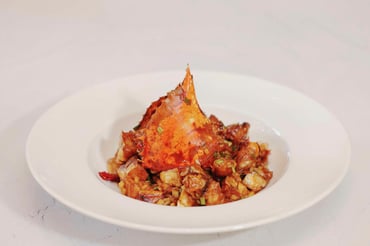 红膏咸炝蟹是宁波最具代表性的生鲜腌制冷菜之一。龙苑选用宁波空运梭子蟹,出海后采用现代冷冻技术低温急冻,保持无菌且鲜美,仅用盐和水进行腌制。装盘时,讲求“十八斩”——厨师需以十八刀将一只蟹斩拆成小件,每一件都需让食客尝到鲜甜的蟹肉和滑润的蟹膏,佐以几点陈醋,吃起来冰凉爽口,唇齿留香。用江浙方言来形容,就是“鲜的眉毛都掉下来了”。