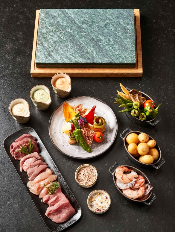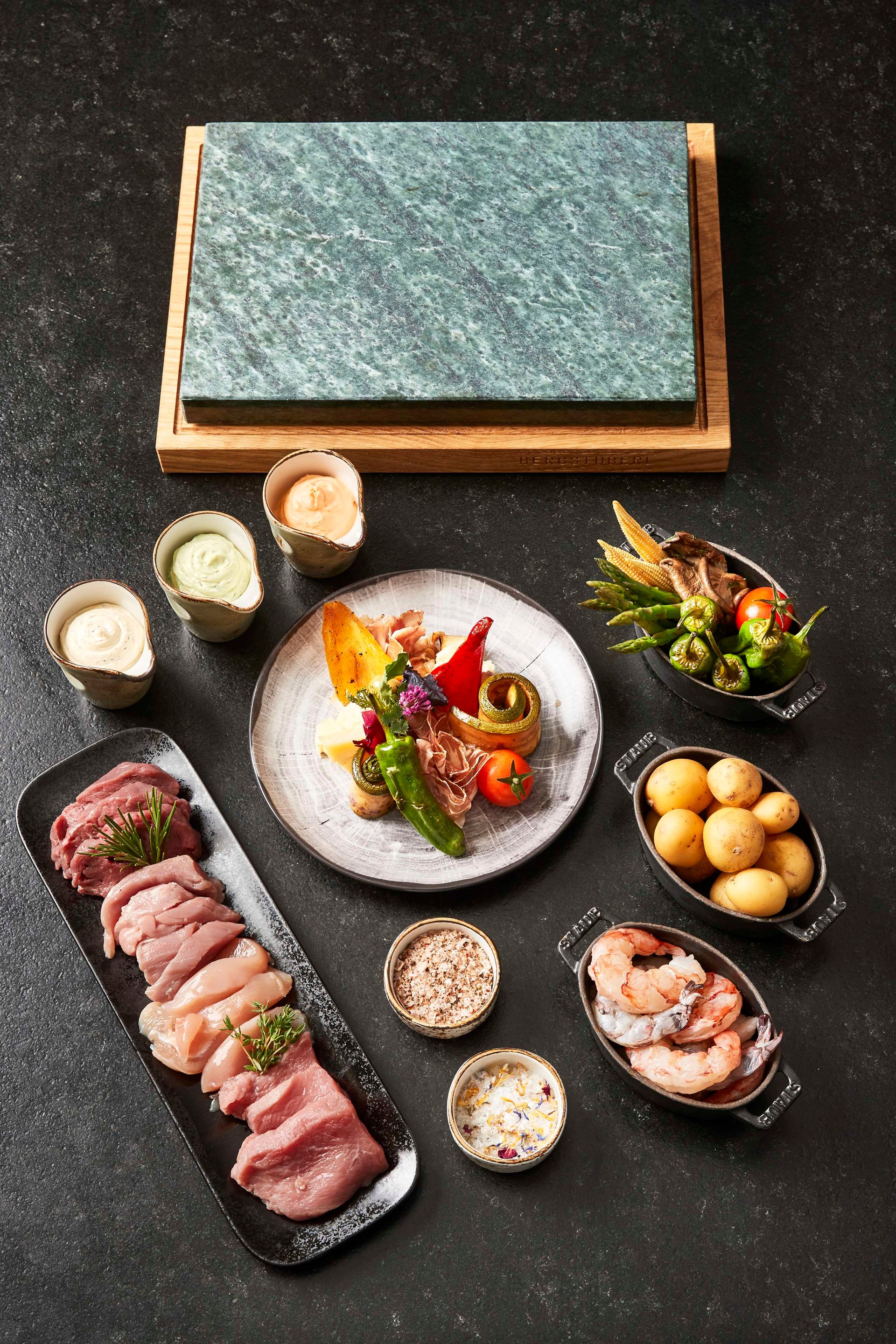 菜单包括作为开胃菜的山地农夫沙拉,然后是热石主食,可选择肉类、鲜鱼、时令蔬菜、配菜以及自制酱汁和蘸酱。您可以在 300 度的热石上按自己的喜好煎制所有食材。甜点方面,我们为您准备了新鲜烘焙的蛋香煎饼,配以杏酱和香草冰淇淋。