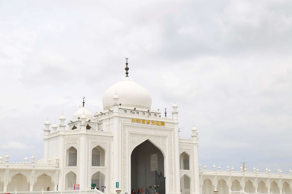 中华回乡文化园主体大门是借鉴印度泰姬陵设计建造的。她高38米,长206米,即便是站在很远的地方也能够看得到她的身影。站在她的面前,她的高大、伟岸、恢宏,给你以视觉的冲击。走近她,她洁白的身躯、饱满的穹顶、绚丽的浮雕、缤纷的彩绘、精巧的结构,在蓝天白云的映衬下,给你的是心灵的震撼。来到这里,你会被她浓郁的伊斯兰风格所吸引、所感染、所陶醉;你会明白什么是圣洁的天堂;你还会深深的感受到,来到这里心灵即将经受一次伊斯兰文化的洗礼。这是建园人的梦想,也是所要达到的目的,更是中华回乡文化园所要突出的主题。
