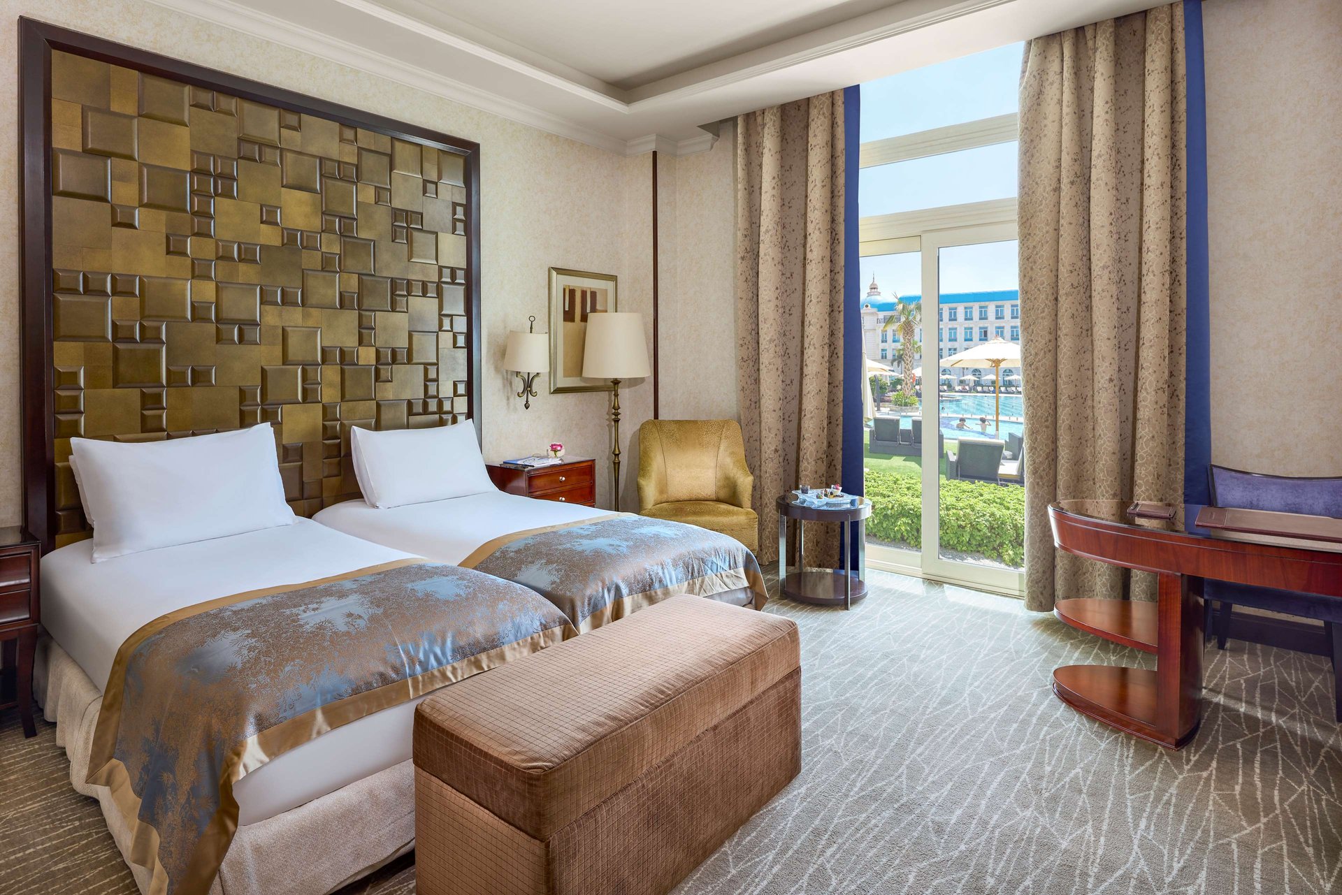我们的超豪华泳池房因其一览无余的泳池景观而引人注目 面积,丰富的装饰和特点: