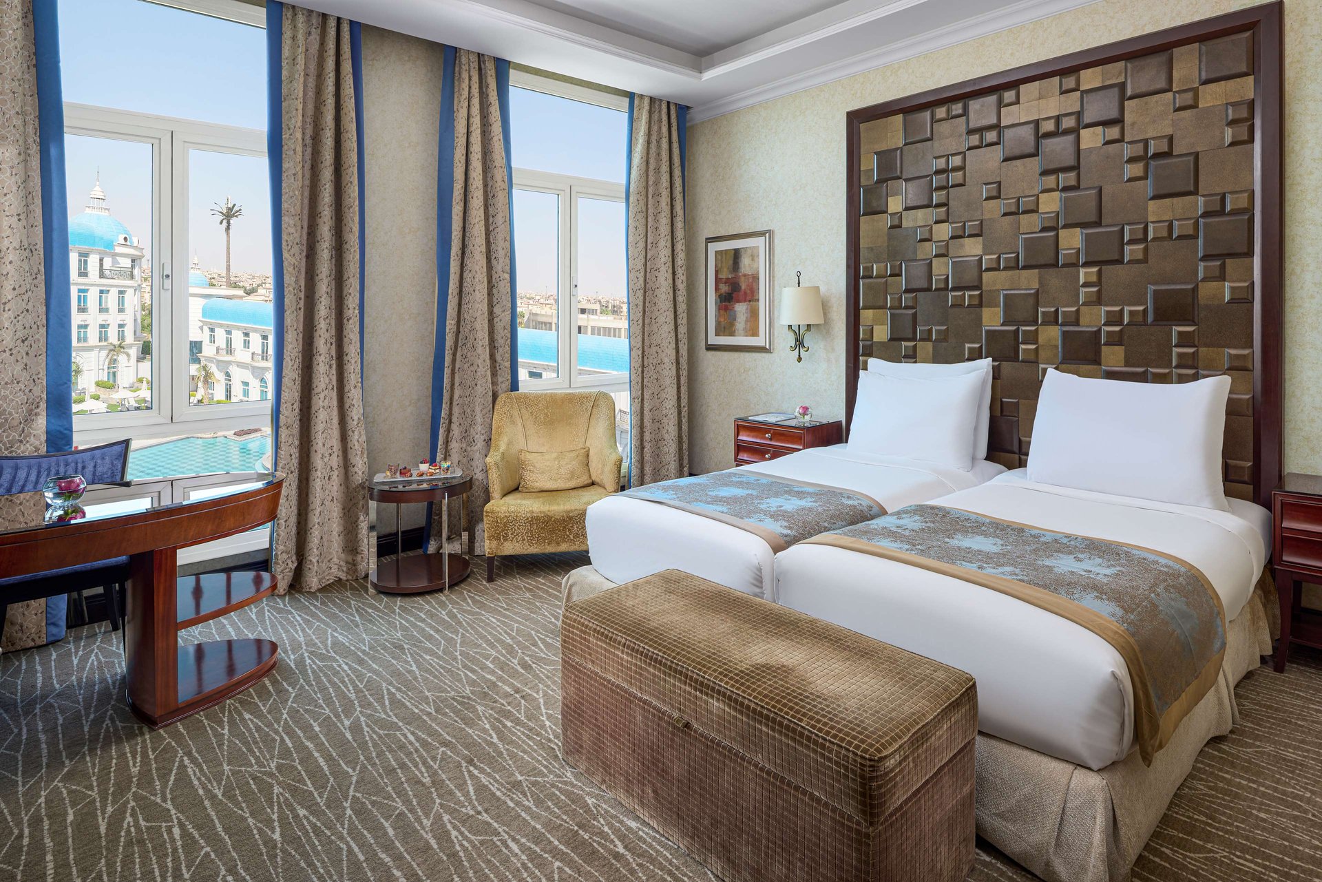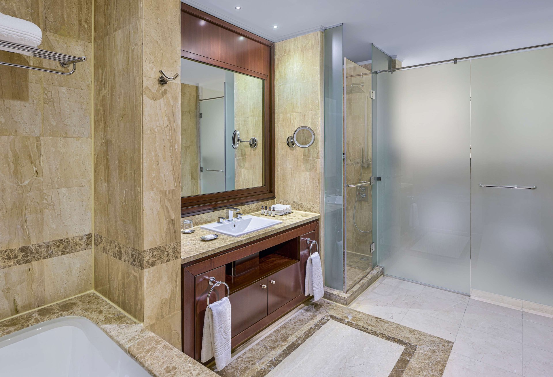 和宽敞的浴室。 这间客房可俯瞰泳池的壮丽景色