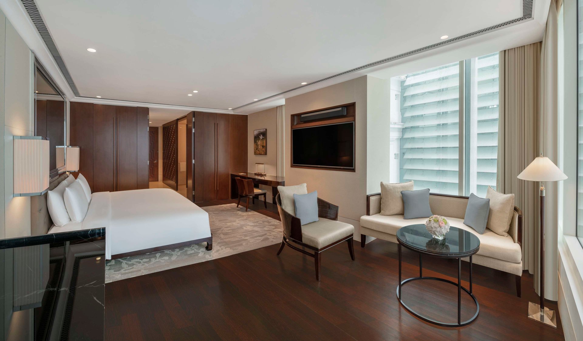 宽敞舒适的尊优豪华客房(50 平米/ 538 平方英尺)由 Jaya Ibrahim 操刀室内设计,为灯罩和飞檐融入鱼尾狮风格图案,巧妙致意新加坡的标志性元素。尊优豪华客房可提供连通房。每间客房至多可加一张床,视供应情况而定,并需额外收费。