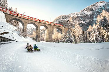 Die längste beleuchtete Schlittelbahn Europas ist nur eine kurze Fahrt entfernt. Die kurvenreiche und abenteuerliche Strecke entlang der Albulabahn eignet sich sowohl für Familien als auch für Abenteuerlustige. Von St. Moritz aus erreichen Sie Preda mit dem Zug in rund 30 Minuten. Dort holen Sie Ihren Schlitten ab und laufen zum Startpunkt. Die 5 km lange Strecke endet in Bergün, wo Sie den Schlitten entweder zurückgeben oder mit dem Zug zurück nach Preda fahren können, um eine weitere spannende Fahrt zu erleben. Abenteuerlustige Gäste können mit der Sesselbahn nach Darlux fahren und von dort aus eine steile Abfahrt nach Bergün unternehmen.