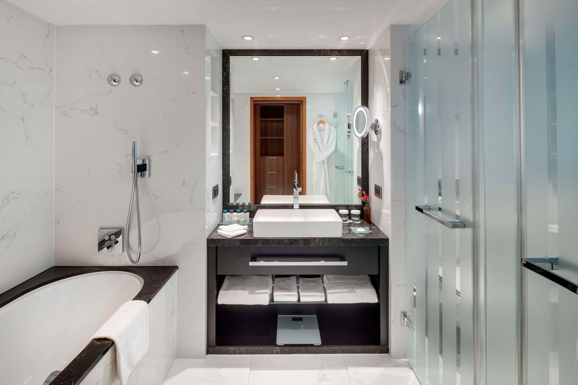 Unsere ikonischen Corvinus Fashion Street View-Zimmer bieten ein hohes Maß an Komfort in einem einzigartigen modernen Stil. Die kürzlich umgebauten Räume bieten einen Blick auf die prächtigen Gebäudefassaden der Jahrhundertwende entlang der Fashion Street. Die ruhigen und geräumigen Zimmer sind auf den Komfort anspruchsvoller Reisender ausgerichtet. Das Dekor mit den Gold-, Grün- und Himmelblautönen der Vorhänge und Wandteppiche harmoniert mit der dezenten, modernen Einrichtung. Das große Doppelbett und die zusätzlichen Serviceleistungen bereichern den Aufenthalt sowohl für Geschäftsreisende als auch für diejenigen, die Budapest in aller Ruhe erkunden möchten.