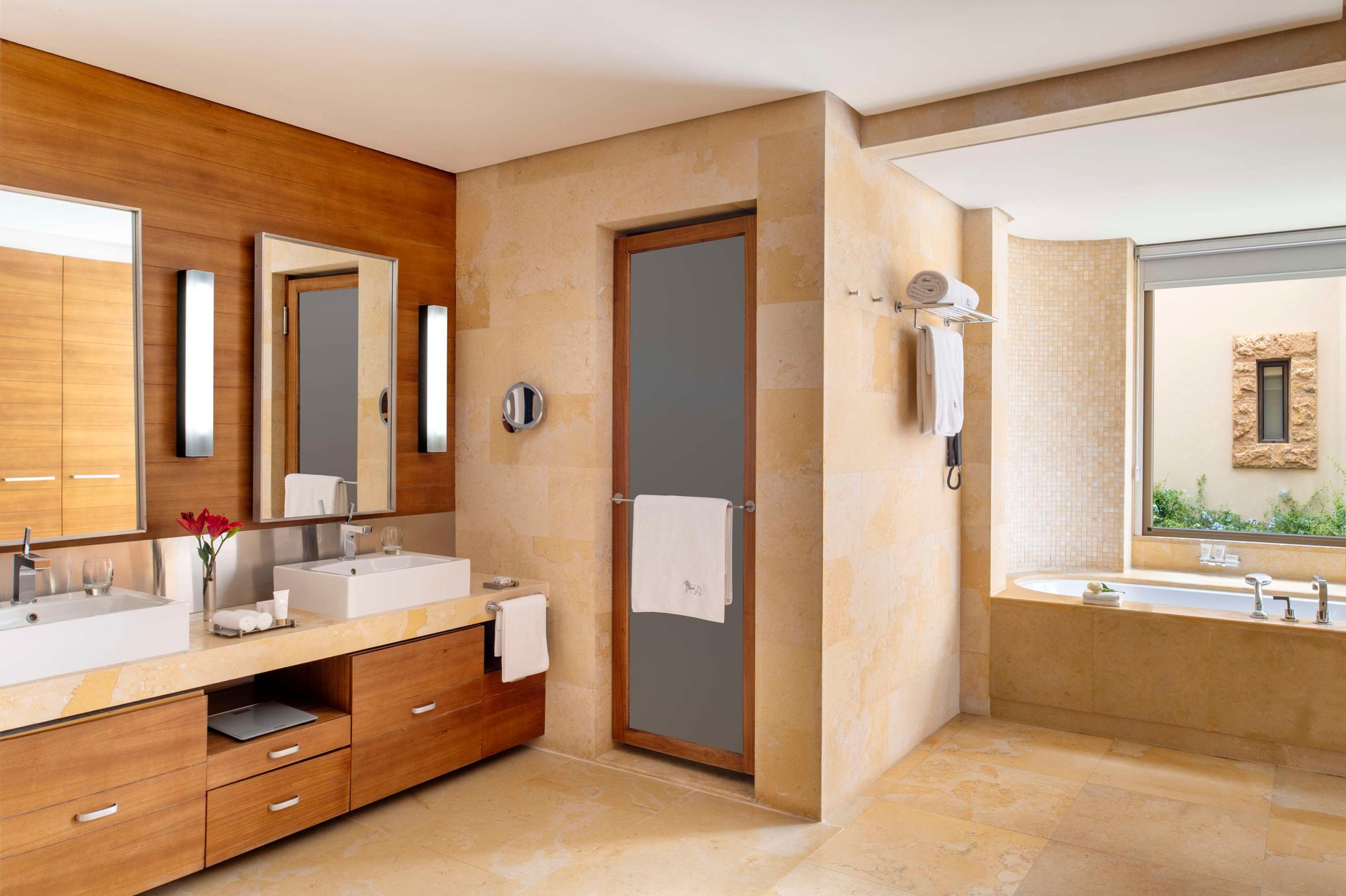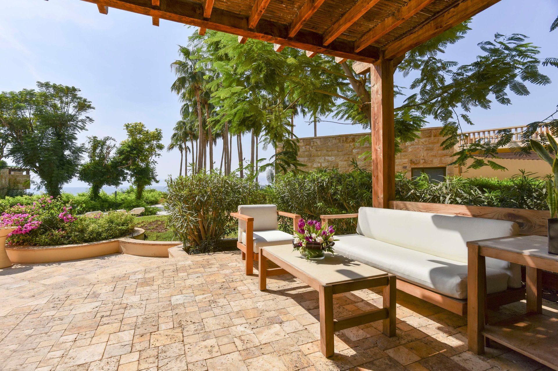 Individuell einstellbare Klimaanlage, Schreibtisch, geräumiger Kleiderschrank, 49-Zoll-Smart-TV mit internationalen Kanälen, elektronischer Zimmersafe. Die Bäder sind aus regionalem Stein gebaut und verfügen über ein Bidet, einen Vergrößerungsspiegel, eine separate Dusche und eine Badewanne mit Blick auf das Tote Meer sowie ein Doppelwaschbecken. Alle Zimmer verfügen über die folgenden Annehmlichkeiten und Einrichtungen: Kempinski Badezimmerausstattung, Bügelbrett, kostenlose Minibar (Softdrinks), kostenloser Internetzugang, Tee- und Kaffeezubereitungsmöglichkeiten (einschließlich Nespresso-Maschine). Die Ishtar-Suiten befinden sich im Erdgeschoss und verfügen über einen Sitzbereich im Freien, ein Bügelbrett, eine Veranda mit Terrassenmöbeln, einen direkten Zugang zum Pool oder zum Strand und liegen im Village.