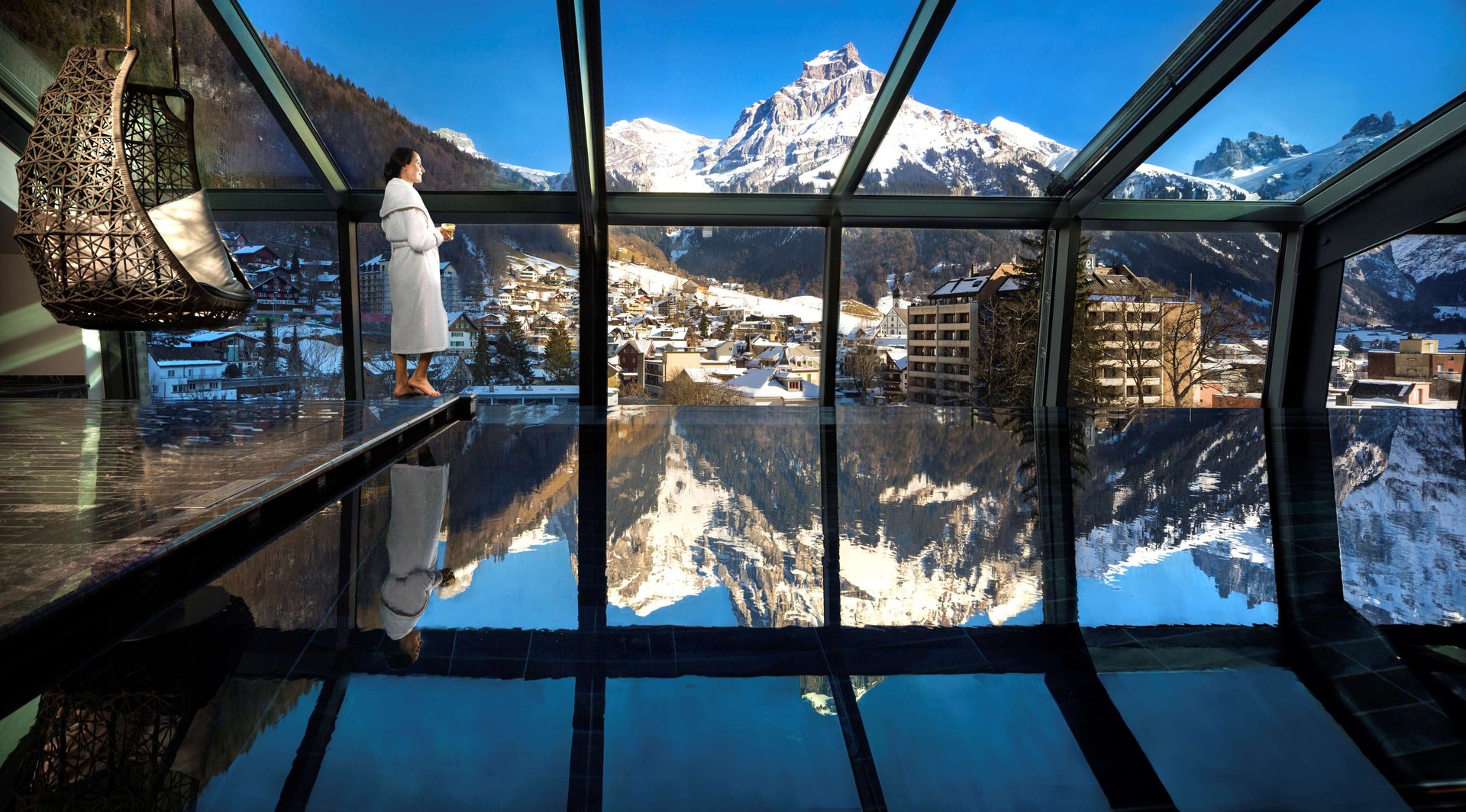 Schwimmen Sie hoch über den Dächern Engelbergs in den siebten Himmel: Vom 15 Meter langen Infinity-Pool geniessen Sie durch Panoramafenster (mindestens) eine Fünfsternesicht in die Bergwelt. Oder erleben Sie das Prickeln im 32°C Grad warmen Whirlpool: Es lohnt sich, die Augen dabei nicht allzu lange geschlossen zu halten, denn vom harmonisch angelegten Becken haben Sie freie Sicht auf den Engelberger Hausberg, den Hahnen.