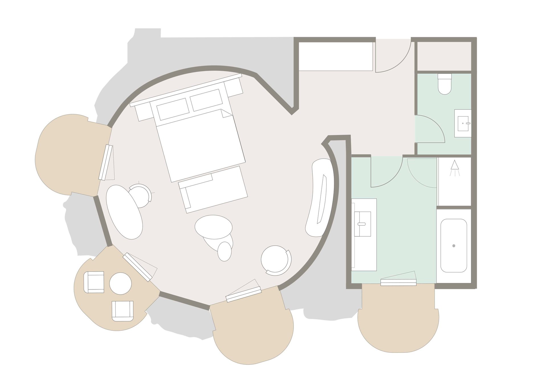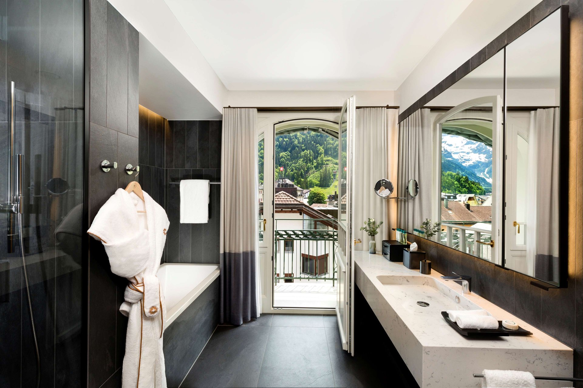 Charmant und wahrlich aussergewöhnlich: Schon der rundförmige Grundriss der Eckzimmer betört. Nach Süden ausgerichtet und vom Licht geküsst, sind die Räume geprägt von einer unvergleichlichen Atmosphäre. Auf den Balkonen lässt es sich gemütlich Kaffee trinken, Zeitung lesen und die Aussicht über die Dächer des Dorfs und in die Berge geniessen. Die geräumigen Bäder mit Wanne, begehbarer Dusche, Tageslicht und Bergsicht setzen den Belle Époque Zimmern die Krone auf.
