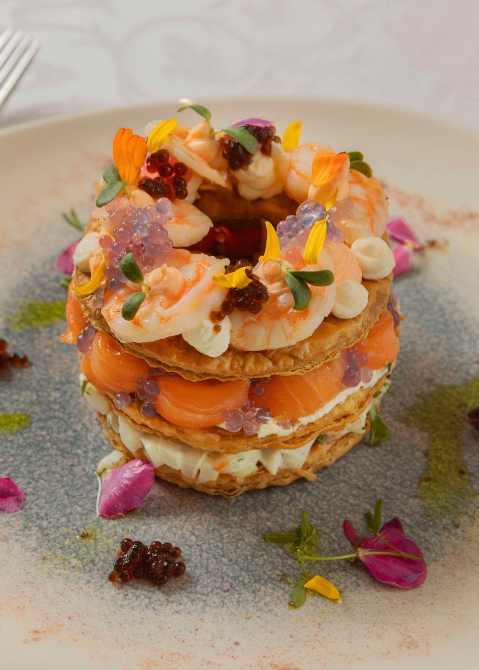 Verwöhnen Sie Ihre Sinne mit diesem exquisiten Meeresfrüchte-Millefeuille, das von unserem Küchenteam im The Blue Restaurant & Grill köstlich zubereitet wird.
