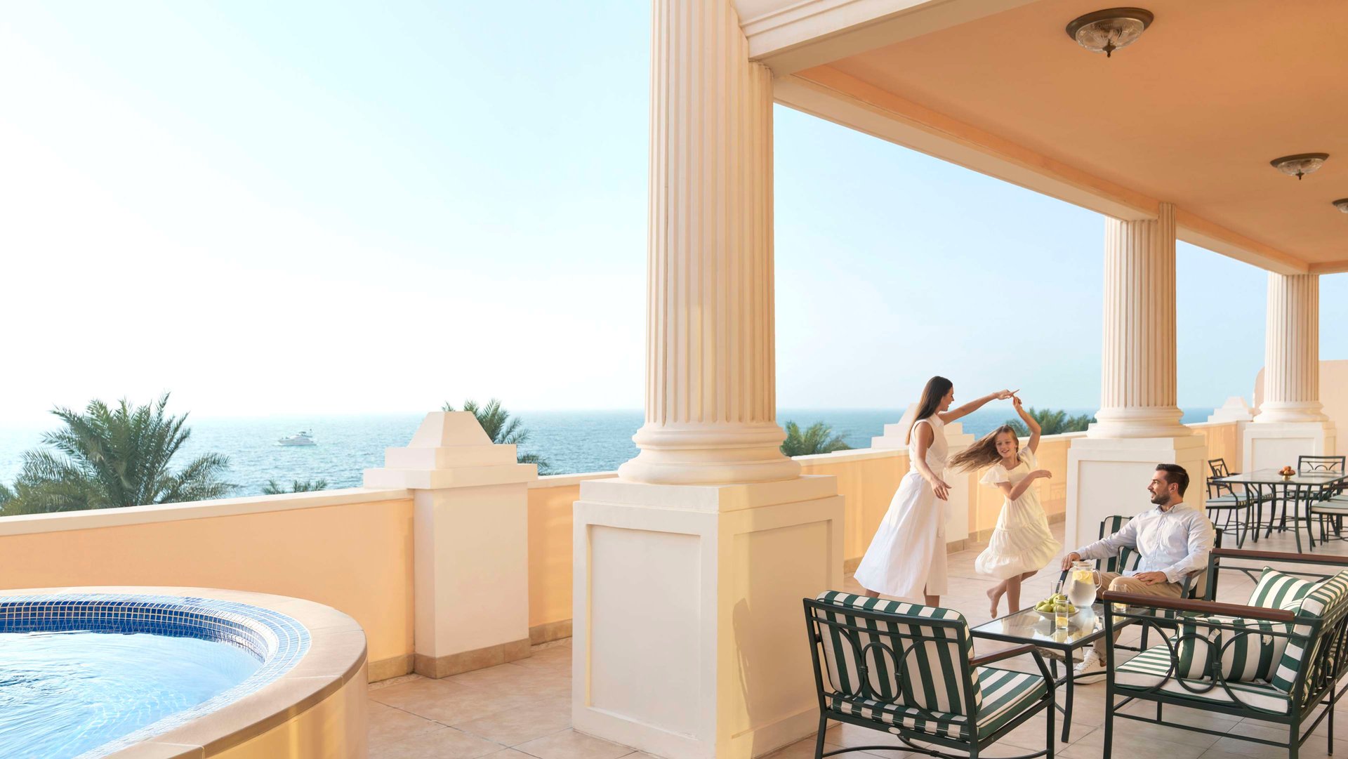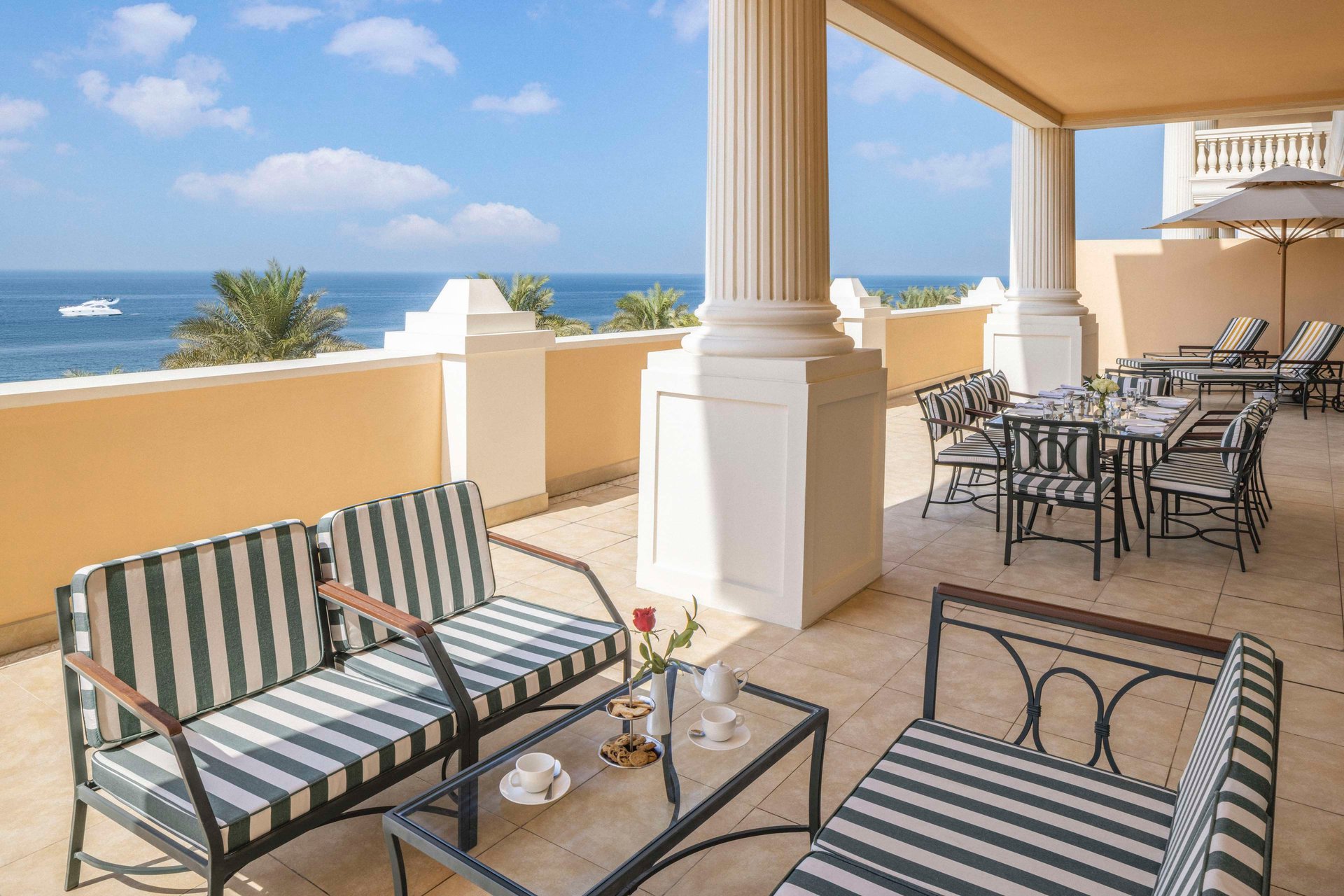 Wer auf die Terrasse geht, sieht ein atemberaubendes Panorama vor sich. Ob Sie nun auf das azurblaue Wasser des Arabischen Meeres oder die ruhige Palmenlagune blicken - vor dem Hintergrund der ikonischen Skyline von Dubai ist jeder Blick ein wahres Meisterwerk für sich. Bei einer sanften Meeresbrise und im Schein der Sonne finden Sie Trost und Ruhe und genießen eine Atmosphäre von purer Raffinesse.