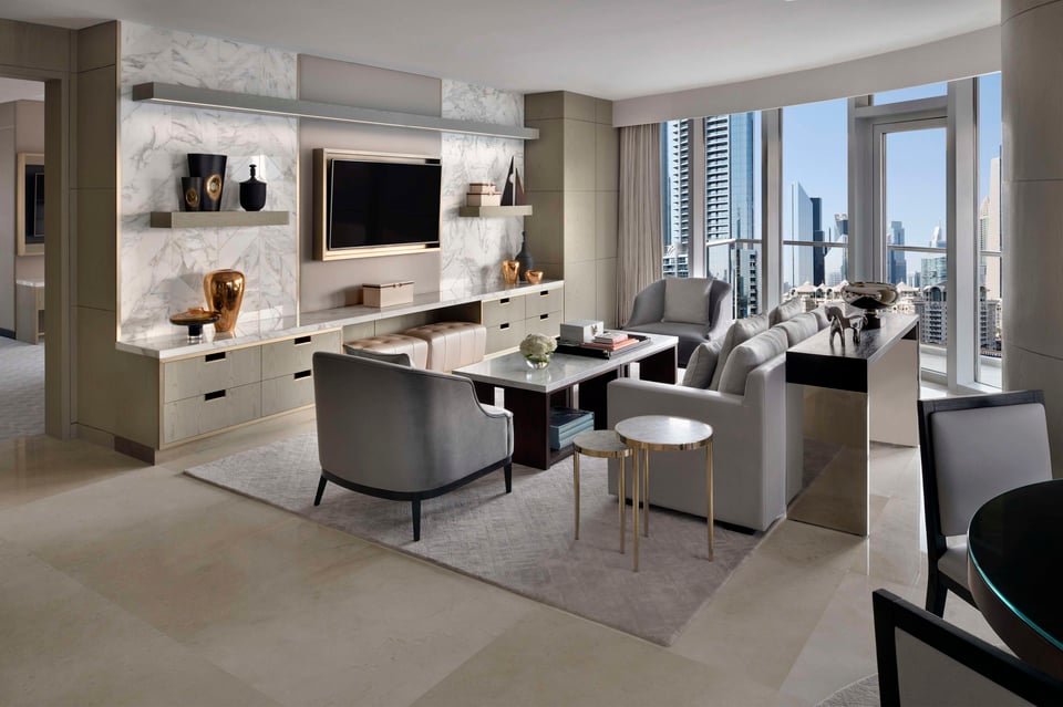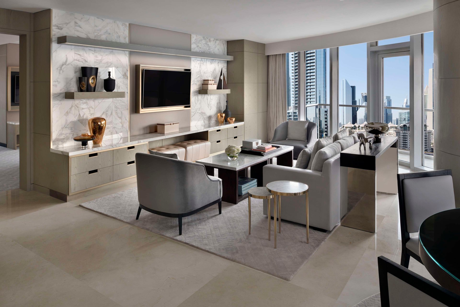 Artfully designed with breathtaking Burj Khalifa views, our Tower Suites promise an impressive experience. Featuring a separate living room, lavish dining area and two alluring bedrooms, luxury resonates throughout. Access complimentary valet parking, an automated in-room TVservice and exclusive Club Lounge, where gourmet flavours will add finishing touches to your stay.