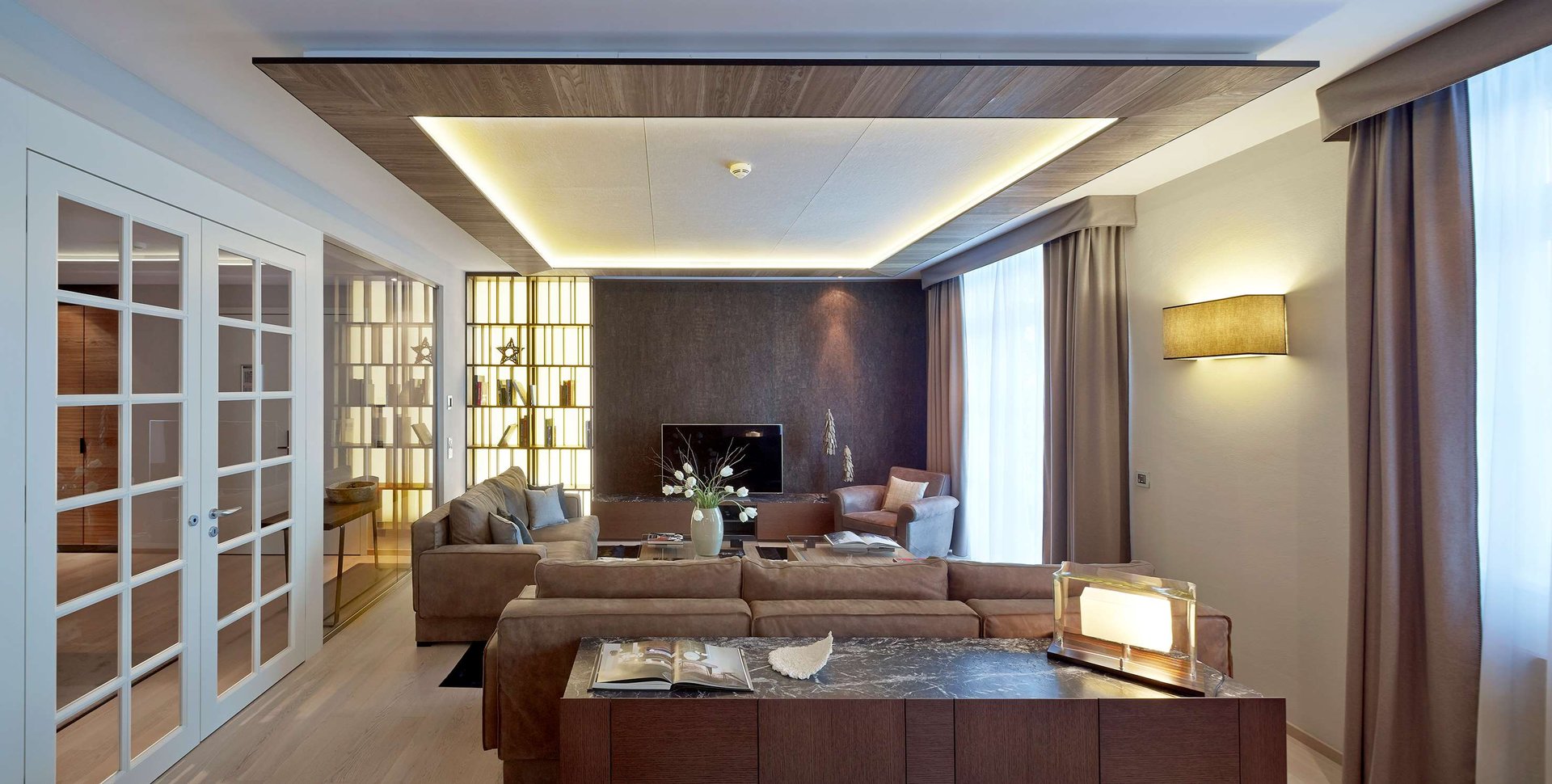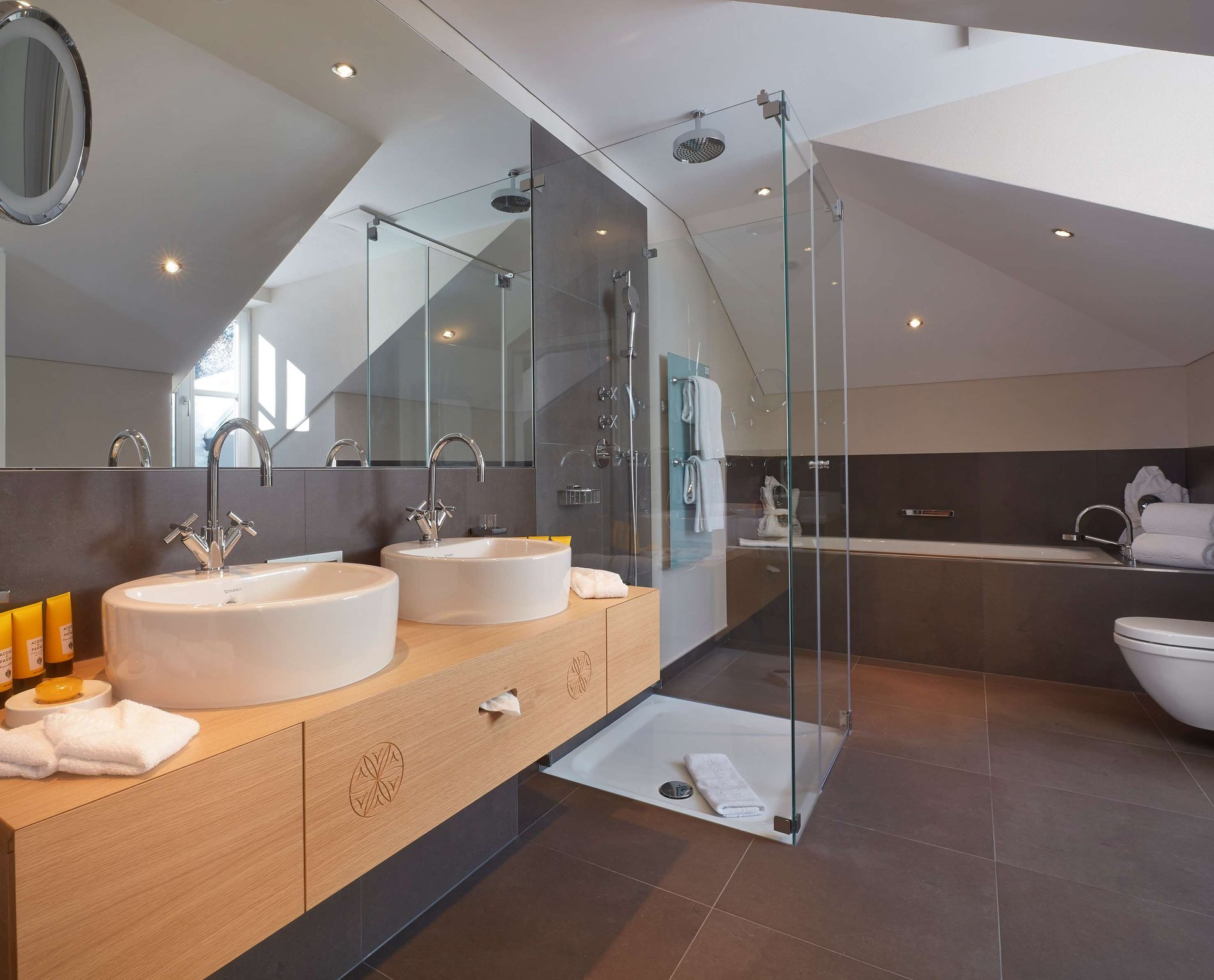 This sophisticated suite features three serene bedrooms with a king-size bed or twin beds, premium linens, and customisable lighting. The three modern, eco-conscious bathrooms are equipped with sustainable toiletries. A spacious living area with a comfortable sofa opens onto a private terrace offering stunning mountain views. Modern essentials – including flat-screen TVs, a minibar, a safe, and complimentary Wi-Fi – enhance this elegant and responsible Alpine retreat, ideal for larger groups.