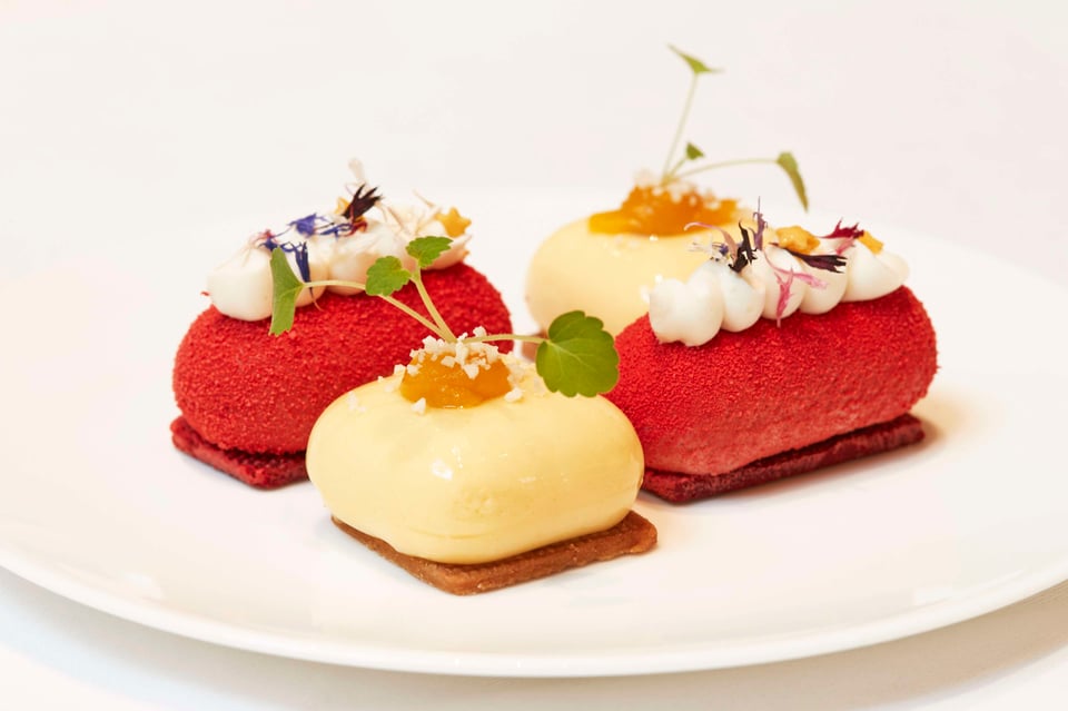 Hazelnut and plum tartlets | Mini Adlon cake | Lady in Red apple | Scones with strawberry and orange jam and clotted cream