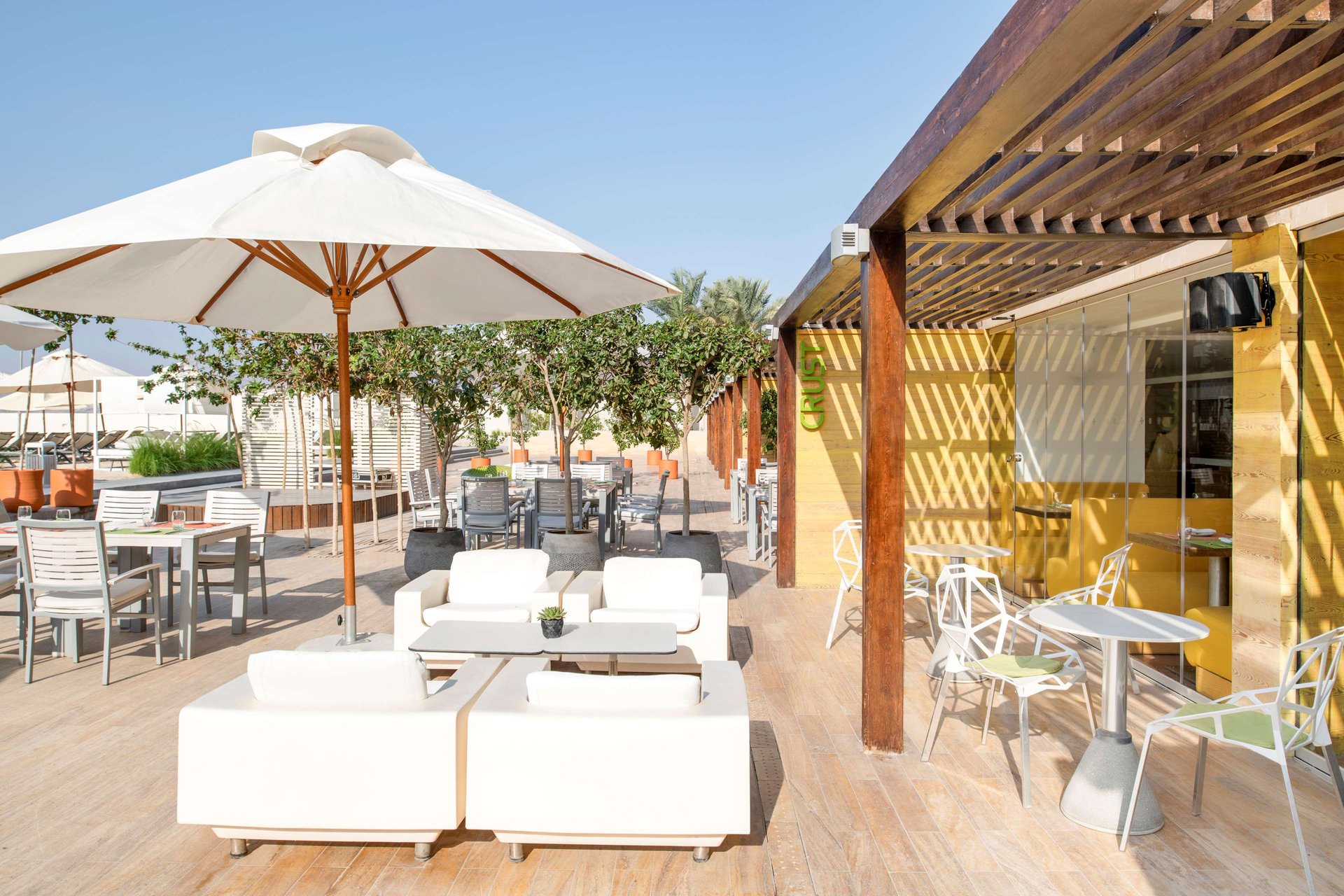 Head to the boardwalk to find Crust, a shoreside restaurant that serves freshly oven-baked pizza, pasta, and deliciously prepared salads. The well-considered menu includes delicious sharing dishes such as nachos with sour cream, homemade salsa and cheddar cheese, crunchy mozzarella sticks and crispy shrimps with a dynamite sauce. The chefs have carefully chosen their favourite dishes from around the world.