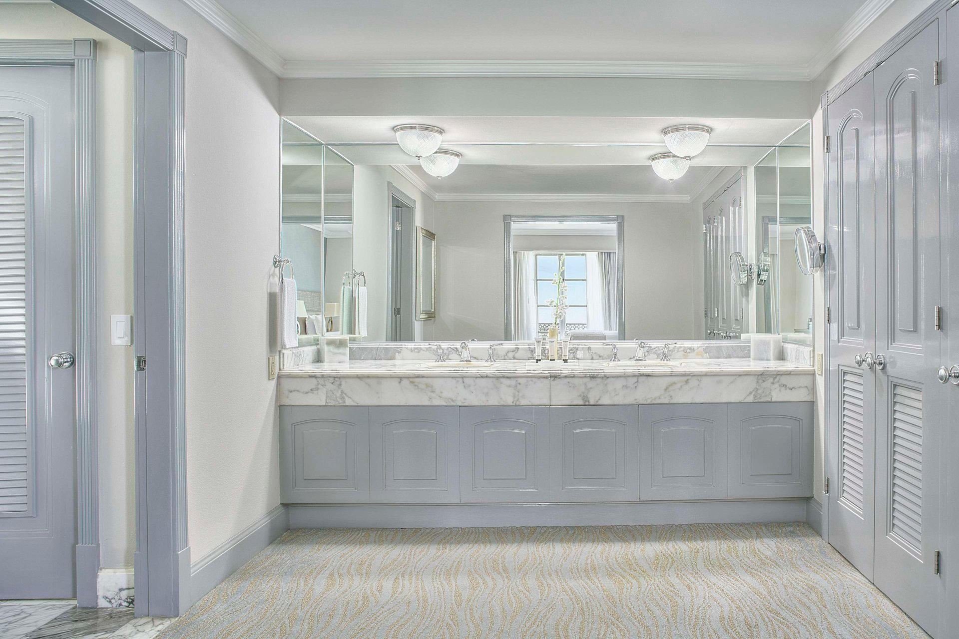 The Club Seafront Suite features a separate living room with a dining area and a minibar to savor your favorite drink. The bathroom has a vanity for two, deluxe designer Salvatore Ferragamo® bath amenities, and a separate rain shower and bathtub.