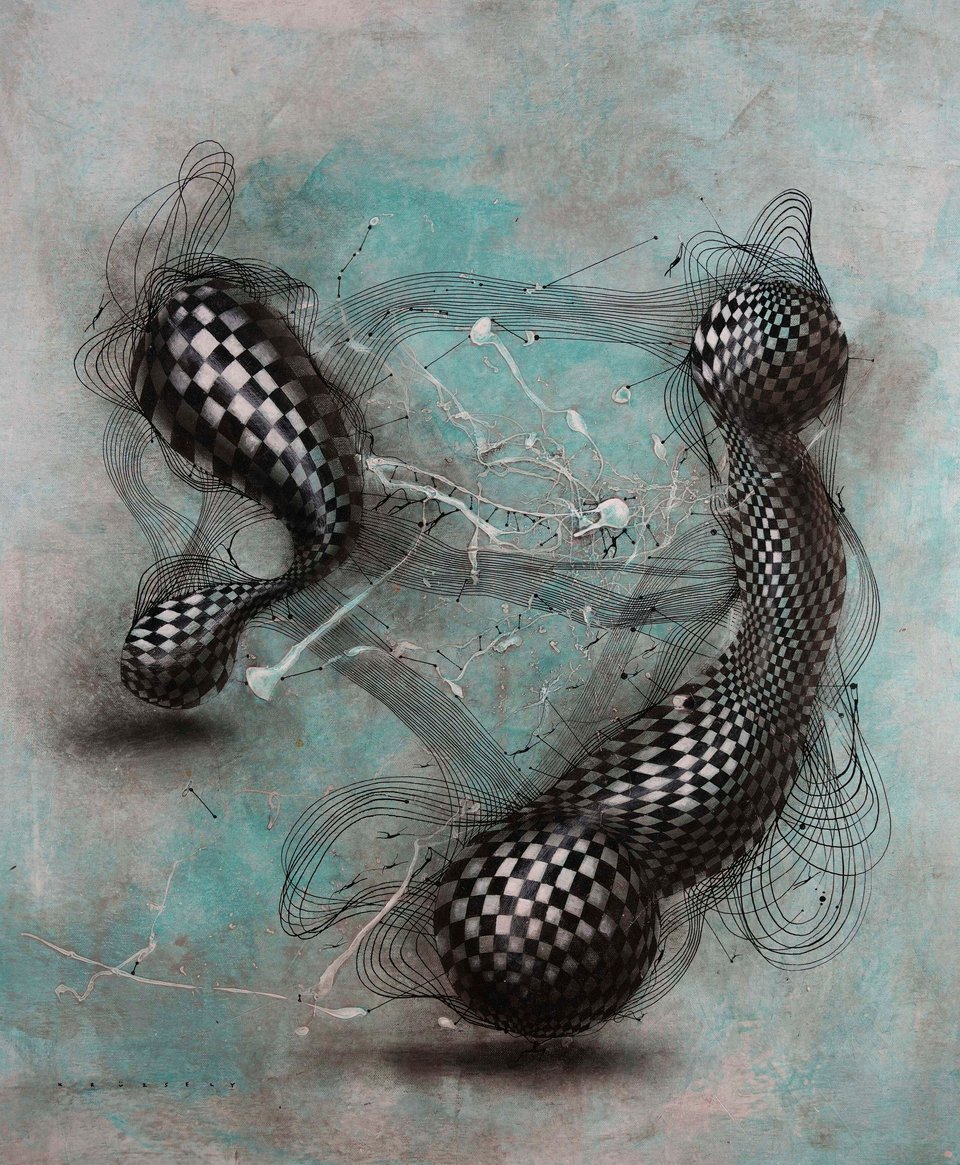 Gábor Krüzsely’s paintings evoke the worlds of Western modernism and abstract expressionism, yet embody a 21st-century, contemporary, poetic, playful and humorous style. His works balance between symbolic abstraction and concrete representation, blending figurative and non-figurative elements. Drawing from surrealism and constructivism, his style conveys social messages through vibrant colours and geometric shapes.