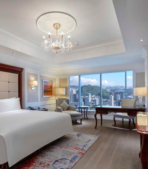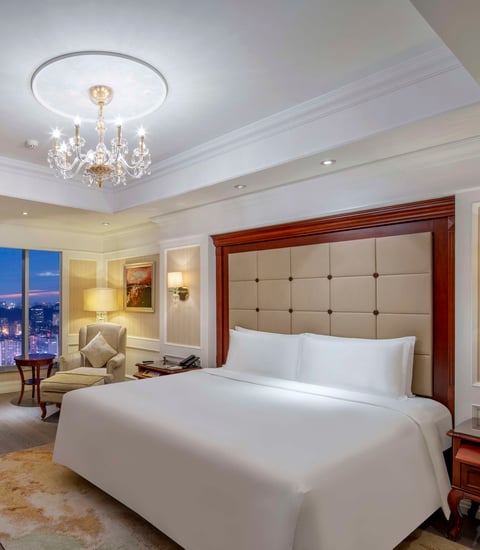 Featuring standalone soaking tubs and curated art collections, all suites at the hotel overlook the city skyline.