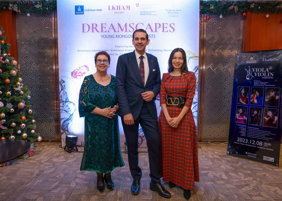 Stefanie Burri, Head of SDC, Mr. Dirk Bansemer of Kempinski Hotel Khan Palace, and M. Natsagsuren, Founder of Lkham Gallery extends sincere gratitude to all guests, also acknowledges the invaluable contributions of all participating artists, pianists, and staff, whose collective efforts made the "Dreamscapes" Vernissage a resounding success, bringing awareness to the incredible young talents within Mongolia's vibrant artistic community.