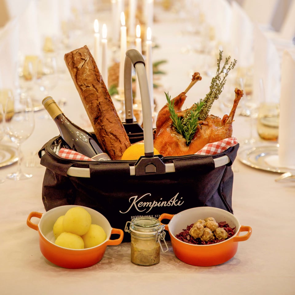 Enjoy a Das Palais Goose at home. You get everything prepared in a Kempinski carrier bag: