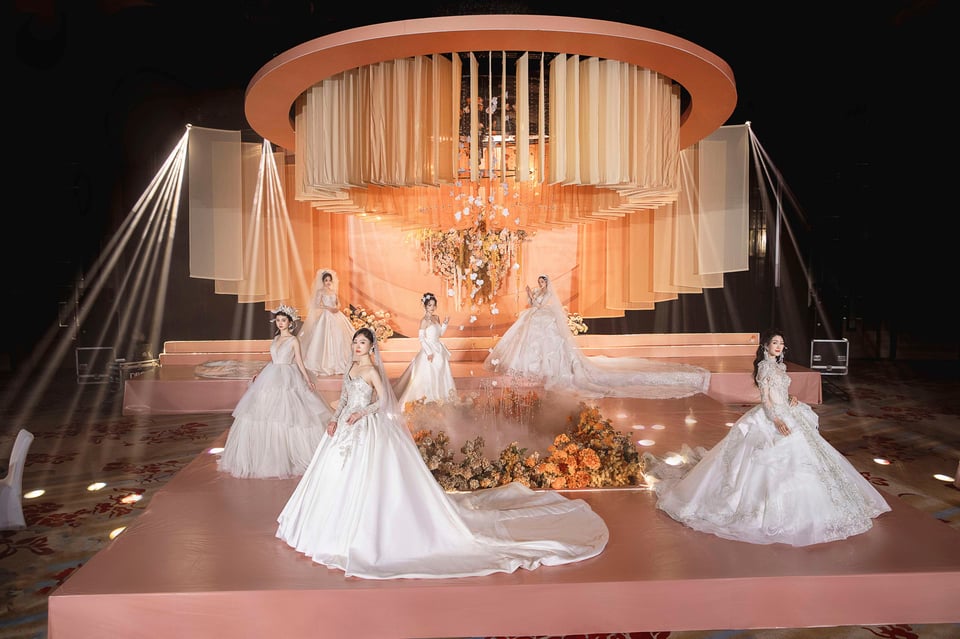 Inspired by the sunrise and sunset, the pillar-less Great China Ballroom was decorated as a romantic palace. The color design combines dawn and dusk with the trending colour of soft peach in 2024, perfectly presents the premium elegance. The water fountain featured in the center of the stage, endowing a hint of vitality.