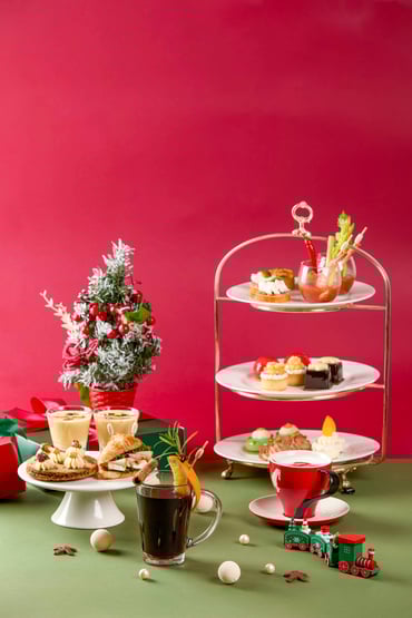 Celebrate the spirit of the season with a sophisticated Afternoon Tea that marries tradition and innovation. Relish savoury creations like the Bloody Mary Prawn Cocktail and Turkey Ham Croissant with cranberry accents, alongside sweet masterpieces such as the Fig Fromage Blanc Candle, Pistachio & Pear and Mont Blanc chestnut delight. Paired with mulled wine or aromatic coffee, this festive indulgence offers a perfect escape into holiday magic.