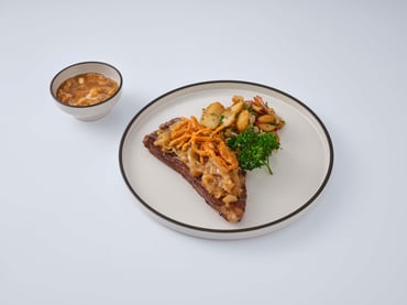 For the German-style roasted beef with onions, Chef Leon has elevated the dish by enhancing the meat quality, ingredients and sauce to create a refined version of this classic. He selects Australian M3 sirloin steak, grilling it with onions until it is juicy and tender and pairs it with crispy fried onions for a rich, layered flavour. The sauce is a key component; Leon employs classic haute cuisine techniques, simmering veal stock with pepper, butter and Marsala wine until it thickens into a demi-glace. A small amount of lightly whipped cream is added to create a silky, creamy texture.