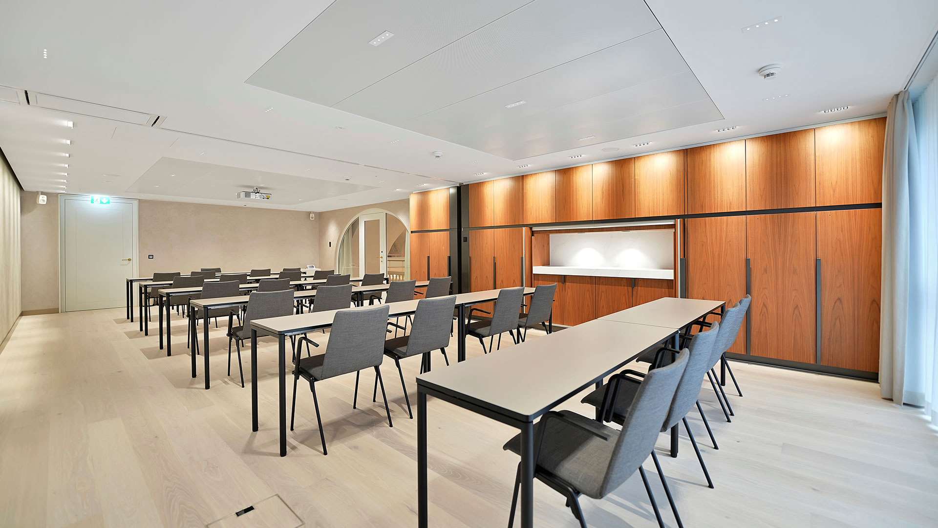 The Händel, owned by Kursaal AG, is available in various configurations depending on the required space—for instance, it can be interconnected with the Mozart Lounge. With a capacity of up to 80 guests in theatre seating and 24 for seminars, the Händel offers versatile functionality. Natural daylight and a loge facing the Kursaal create a pleasant atmosphere.