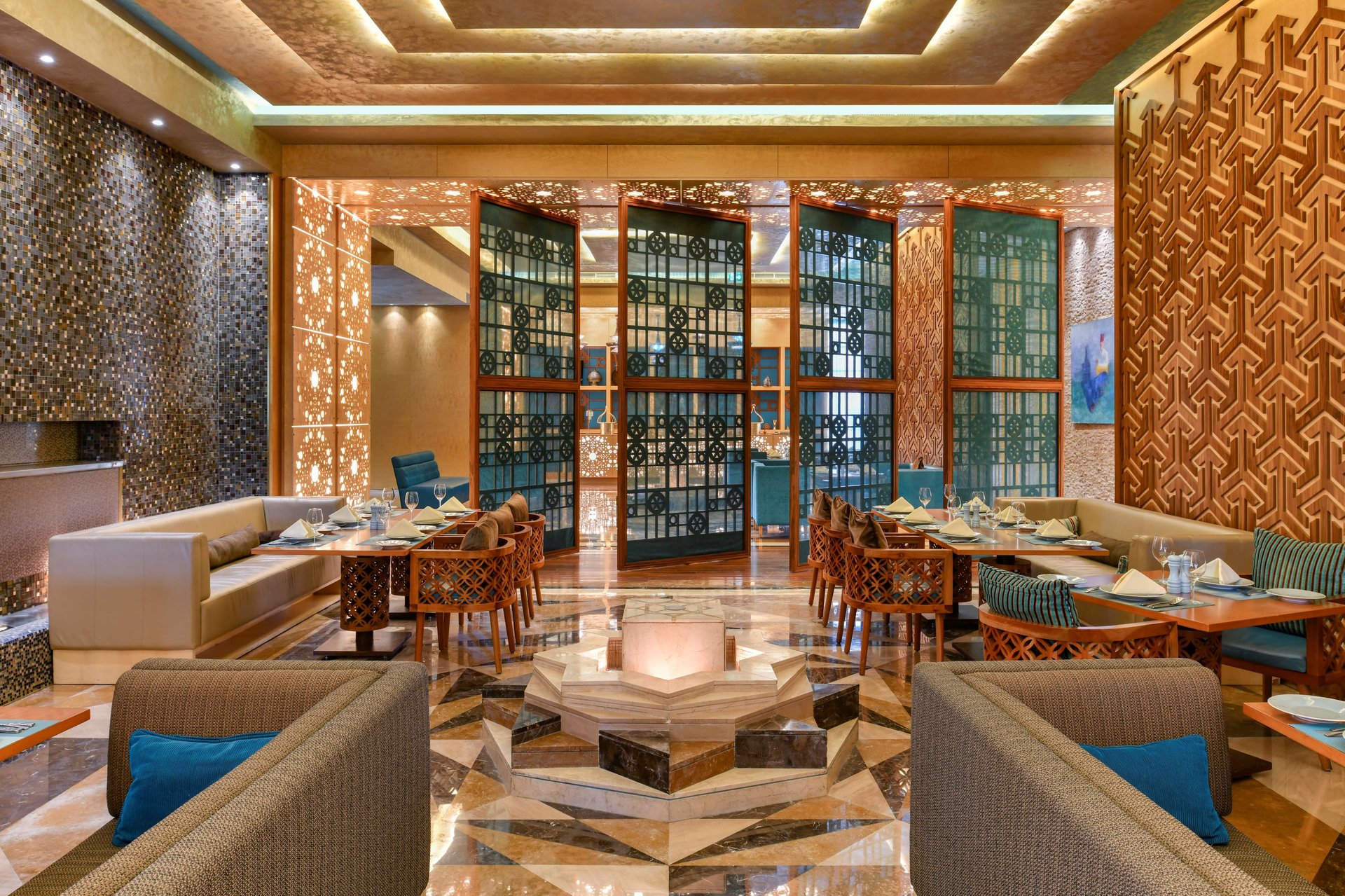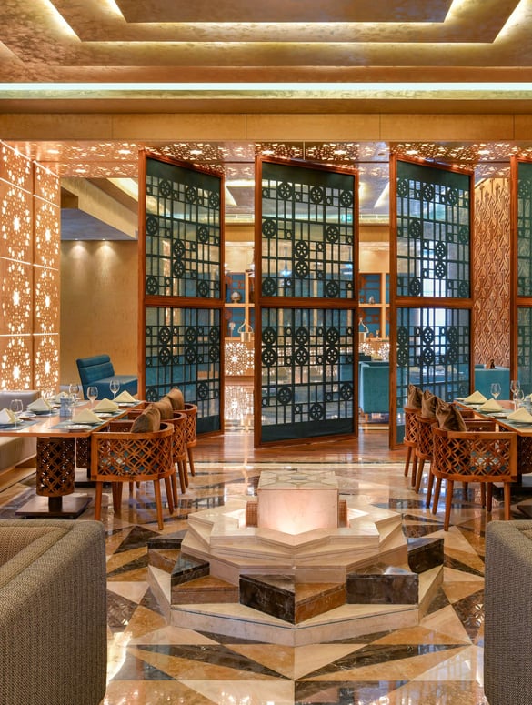 Discover traditional Middle Eastern and Levant cuisine with a unique blend of authentic recipes from the region. Al Sufra, which means "The Dining Room" in Arabic, follows the festivals and seasons of the Levant, celebrating the traditions of this ancient cuisine. With a coffee lounge, open terrace and à la carte dining, the restaurant can be visited any time throughout the day. This contemporary gold and turquoise-themed restaurant is beautifully decorated with stunning art and ornaments.