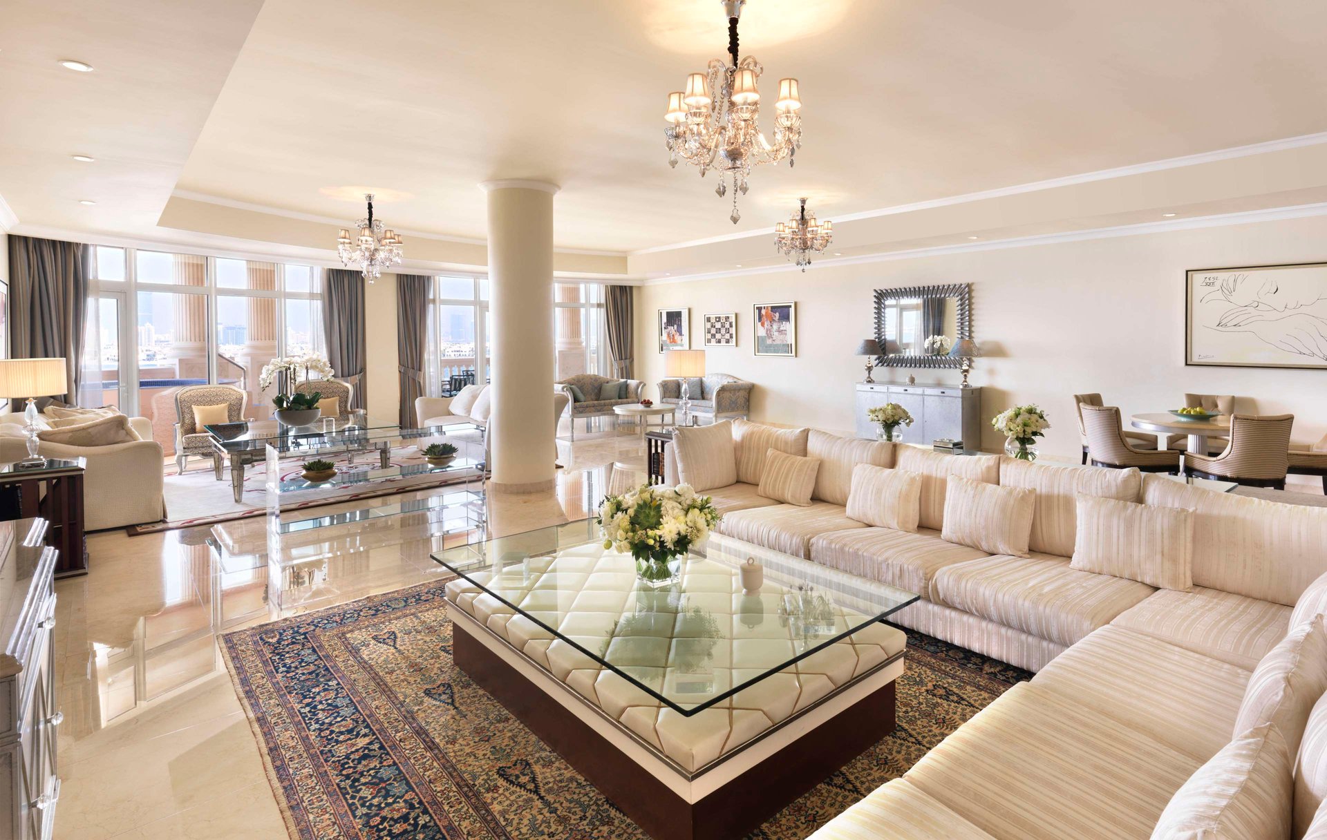 Enter a realm of unparalleled luxury with our expansive 544 sq m Superior Three-Bedroom Penthouse. This resplendent suite transcends mere accommodation; it is a sanctuary where space, comfort and elegance intertwine effortlessly. Behold tranquil vistas of the Arabian Gulf or the serene Palm Lagoon from the sweeping terraces of the living room, each view a picturesque symphony of serenity.