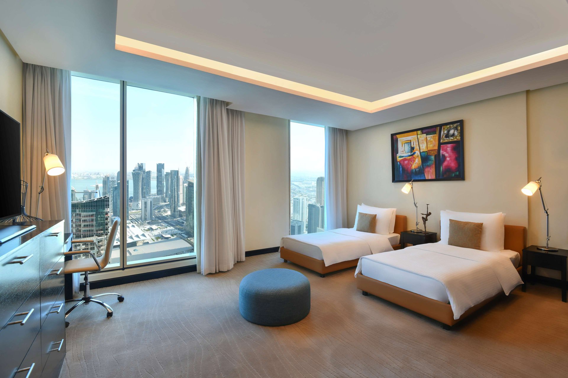 This villa is located on the 58th floor. The entrance floor has two living rooms, fully equipped kitchen, a guest bathroom and a maid’s room. The first upper floor has two bedrooms with a king-size bed and en-suite bathroom each. The second floor consists of a family living room, two bedrooms, one with a king-size bed and one with two single beds (twin beds), and en-suite bathroom each.