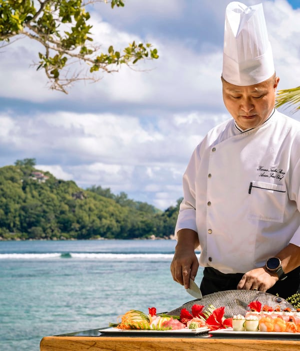Indulge in the ultimate beachfront dining experience at Windsong restaurant in Seychelles, where you can unwind with a refreshing cocktail while savouring exquisite Creole cuisine, delectable seafood and the best sushi on the island.