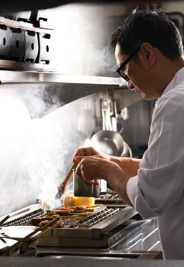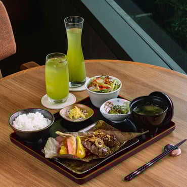 •  Indulge into a set lunch at THB 690++ per set per person, featuring a choice of KI KUSHIYAKI set or HOBA GARLIC BEEF set.