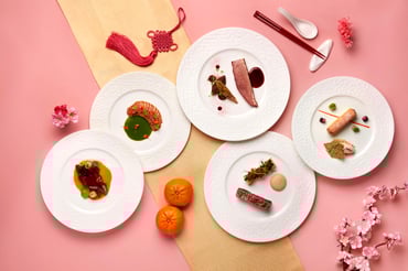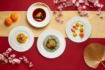 The lunch menu features dishes such as Cured Sword Fish with mandarin orange or Bak Kwa Salad as choice of starter - both quintessential festive dishes to signify abundance and prosperity for the New Year. Chicken Essence Broth with Abalone is another highlight, as is the Fried Black Cod with black moss, ginger and conpoy Jin Long Yu rice for the ultimate umami flavours. Bite into the refreshing osmanthus dessert with homemade marshmallow for a perfectly sweet finish.