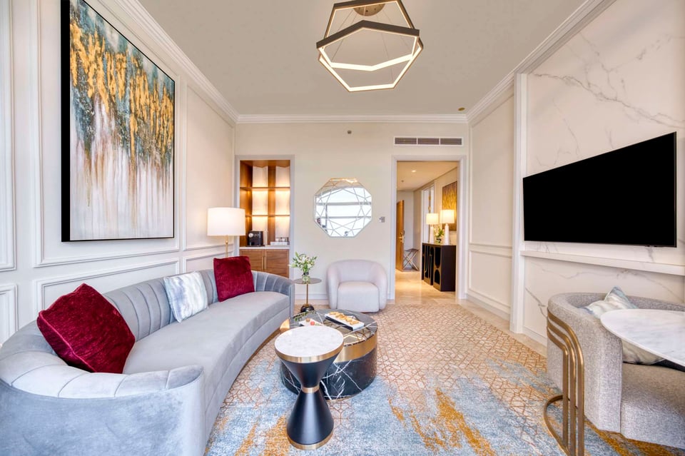 This contemporary suite offers generous living and sleeping areas, thoughtfully designed for a perfect blend of comfort and style. The spacious living room, equipped with the latest technology, provides a luxurious space to unwind while enjoying the breathtaking beauty of the Red Sea. This suite is also accessible for guests with disabilities, ensuring a seamless and comfortable stay for all.