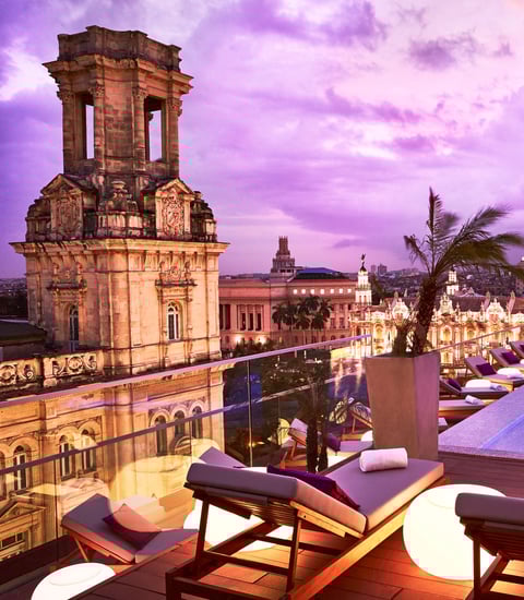 Es increíble estar junto a la piscina de nuestra terraza panorámica, donde las vistas y la piscina infinita se convierten en uno. La iluminación moderna y el mobiliario contemporáneo son un contraste entre el lujo y lo antiguo, pero consiguen cautivar a La Habana Vieja ante los ojos de los huéspedes. La oferta de bebidas se basa en refrescantes cócteles a base de frutas y verduras locales acompañados de tapas del mundo hispano. Para los amantes de los desayunos ligeros, también pueden disfrutarlos con las vistas ideales desde nuestra terraza