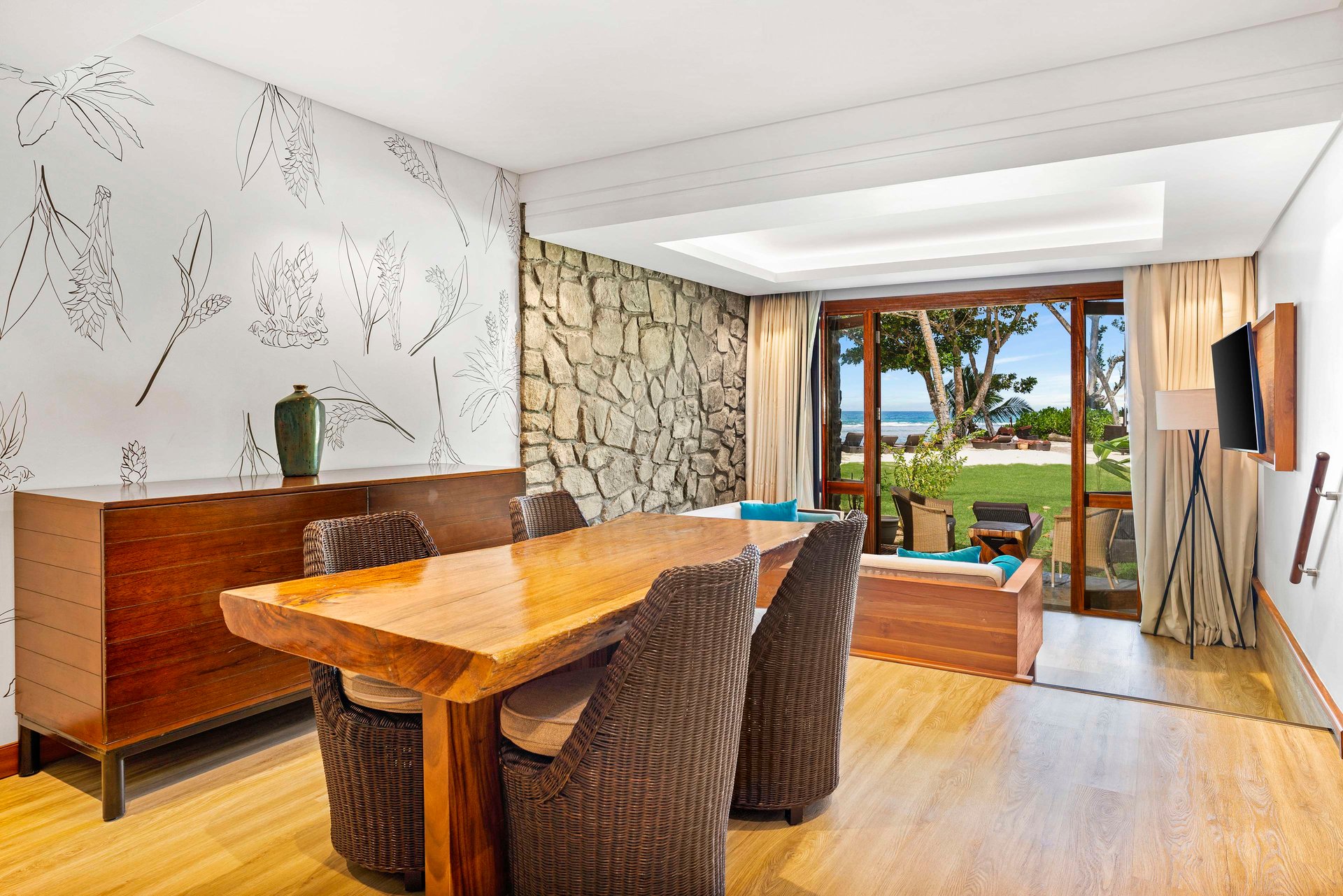 Avec des dimensions généreuses de 57 m², vous vous sentirez comme chez vous dans ce havre de luxe niché dans une luxuriante plantation de cocotiers. La Deluxe Ocean View Suite offre un confort chic dans des tons naturels et une vue captivante sur l'océan Indien. L'élégant lit king-size ou les lits jumeaux vous berceront d'un sommeil réparateur. Vous vous sentirez rafraîchi chaque matin dans la grande douche à l'italienne avec jets horizontaux pour le corps.