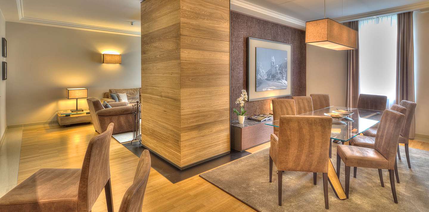 Роскошно оборудованные резиденции площадью от 170 до 180 кв. м с тремя спальнями с современным декором и мебелью в альпийском стиле, обеденной зоной с кухней открытого плана, большим количеством шкафов, ванной комнатой с тропическим душем и ванной, балконом/террасой с панорамным видом на долину Энгадин.
