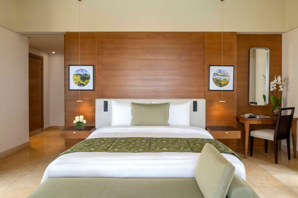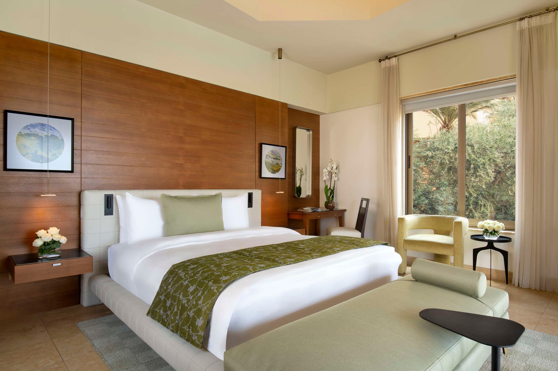 1 большая двуспальная кровать с полом из натурального камня, кондиционер с индивидуальным климат-контролем, рабочий стол, вместительный шкаф для одежды, 40-дюймовый IPTV, электронный сейф. Ванные комнаты построены из местного камня и оснащены биде, увеличительным зеркалом, отдельным душем и ванной. Во всех номерах есть следующие удобства и удобства: туалетно-косметические принадлежности Kempinski, гладильная доска, бесплатный мини-бар (безалкогольные напитки), бесплатный доступ в Интернет, принадлежности для приготовления чая и кофе. Номера на первом и втором уровнях имеют веранду с террасной мебелью.