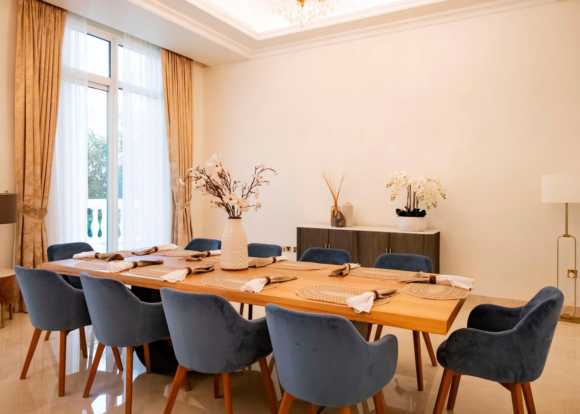 Погрузитесь в настоящий декаданс во время следующего визита в Дубай — снимите отдельностоящую королевскую вилле с пятью спальнями. Благодаря гостиной, игровой комнате, пяти спальням, столовой и 8 ванным комнатам у вас не будет недостатка в пространстве. У вас будет свой сад, игровая комната в подвале, бассейн на крыше и джакузи — это идеальное место для отдыха после насыщенного дня в Дубае.