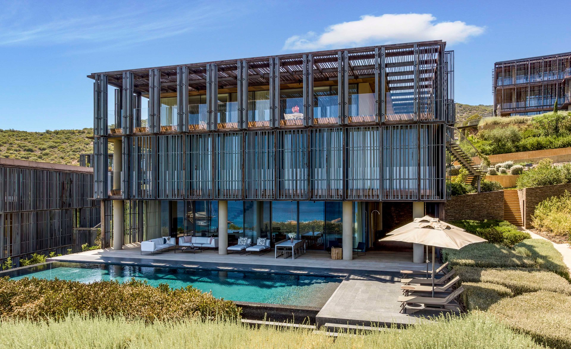 675 sq m 4 yatak odalı dubleks Presidential Rezidans, muhteşem Ege Denizi manzaralı özel havuz, 2 hizmetçi odası, ücretsiz karşılama ikramları, ayrı çamaşır ve kurutma makinesi, duşakabin, indüksiyon ocaklı tam donanımlı mutfak, şarap buzdolabı dahil çeşitli cihazlar sunmaktadır. Rezidanslarda ayrıca yemek odası, oturma odası, şezlong takımı ile özel teras ve balkon bulunmaktadır.